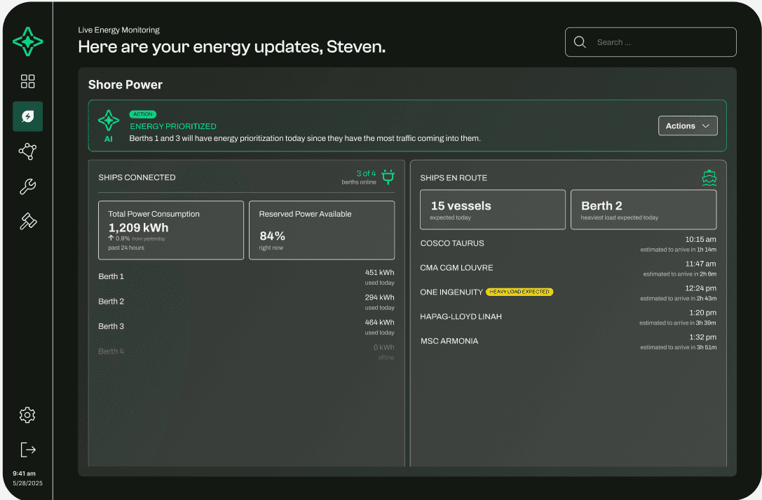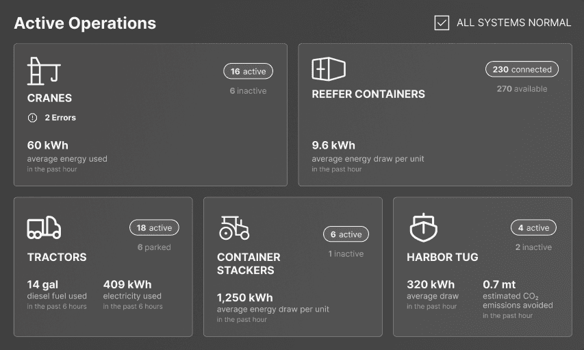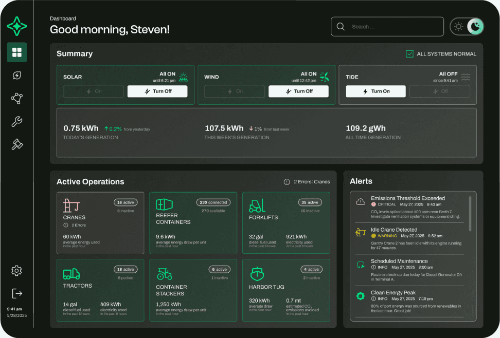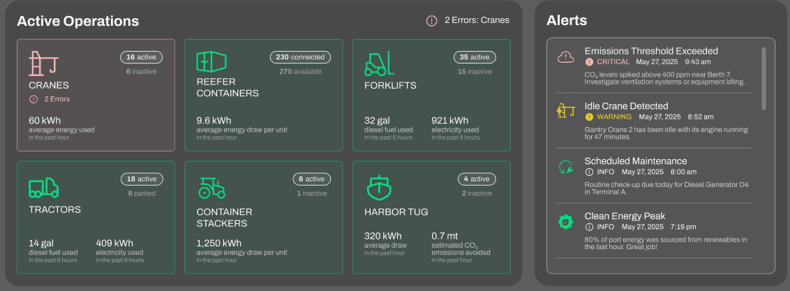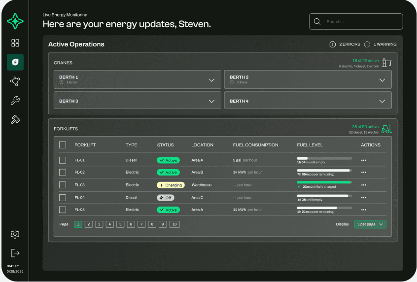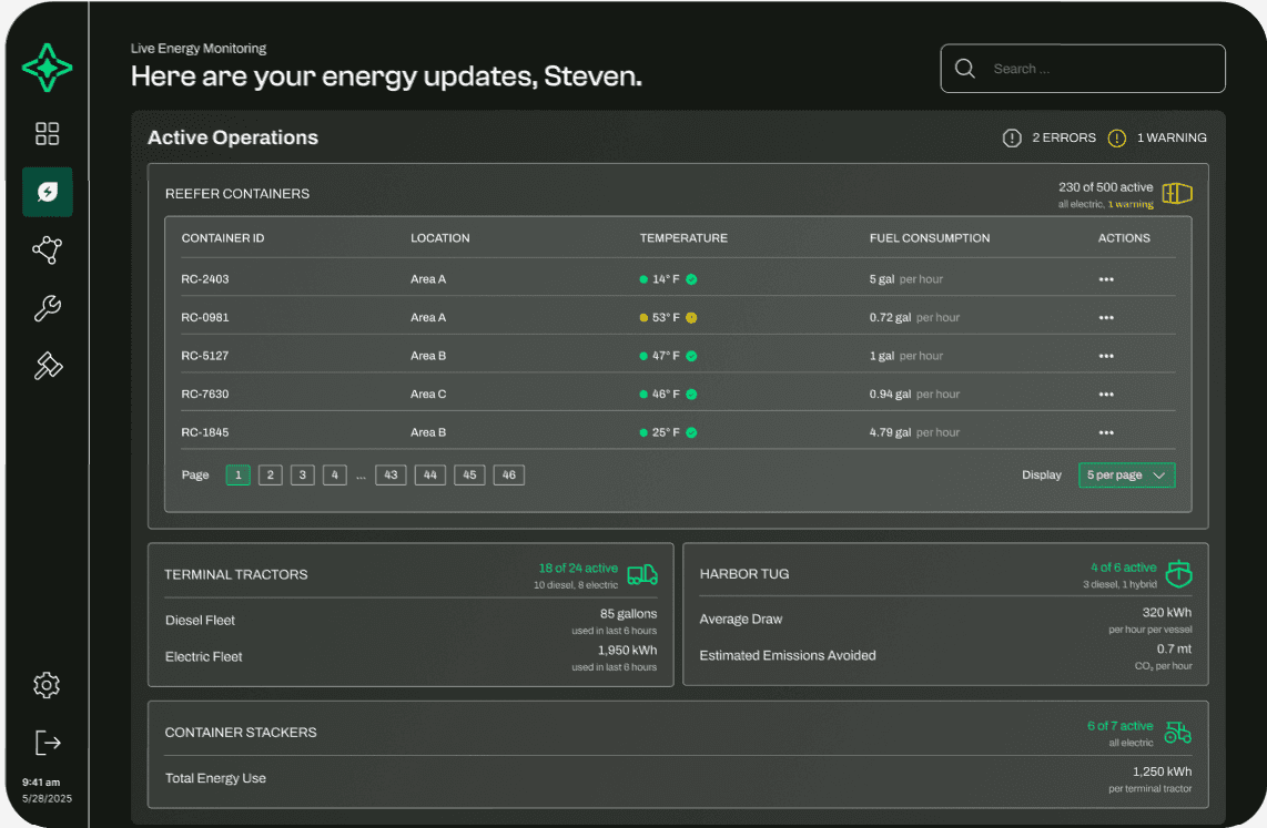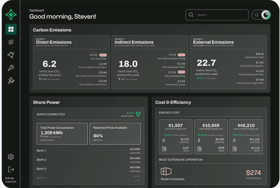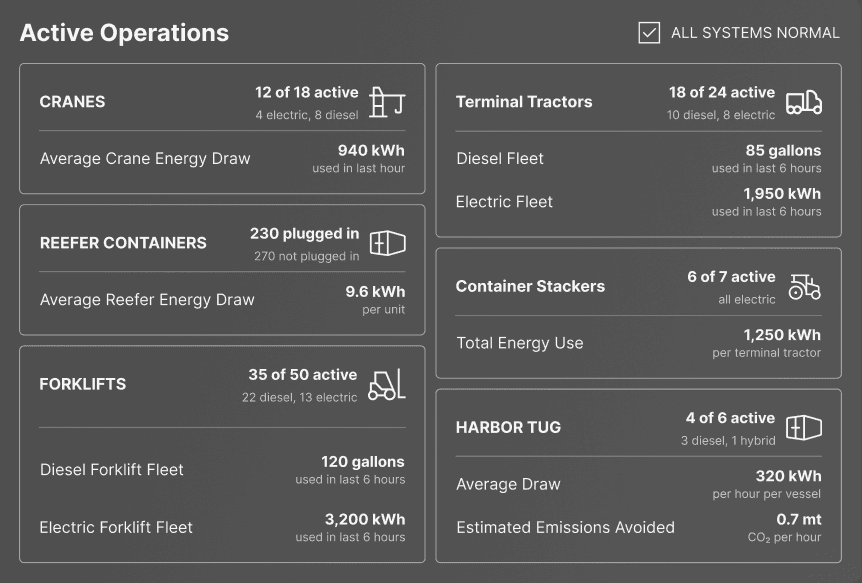 Many U.S. seaports lack systems to track their current fuel consumption and energy usage, making it difficult to identify inefficiencies or plan a transition to electric alternatives. Without clear visibility into their energy baseline, port operators are unable to make informed decisions or measure the impact of sustainable upgrades.